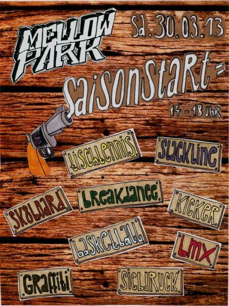 Am Sa.30.03. ist es soweit. Wir starten in die Saison 2013. Zelebriert wir das Ganze von 14-18 Uhr mit Breakdance, Tischtennis, Kicker, Slackline, Siebdruck, Graffiti, BMX, Basketball und Skateboard. Das alles kann man an diesem Tag unter professioneller Anleitung ausprobieren. Natürlich öffnen auch an diesem Tag unser Verleih und der Pavillon. Somit ist sowohl für die Hardware im BMX-und Skateboardbereich als auch für das leibliche Wohl gesorgt. Der Park öffnet um 12 Uhr seine Pforten und ab 18 Uhr könnt ihr den Tag am Osterfeuer mit lecker Stockbrot ausklingen lassen. Wir freuen uns auf Euch!
